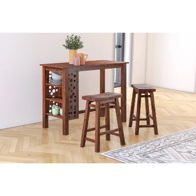 Welcome family and friends to casual after-dinner drinks and easy Sunday brunches around the Brittany 3 piece bar table set. This three-piece set includes everything you need to create a cozy eating nook in the kitchen or dining room space. The bar table is paired with two matching chestnut wire-brush saddle stools. The acacia wood and metal dining table feature a multistep wire-brush finish which enhances the natural beauty of the wood even more. This multi-function dining table also features 3-tiered bookshelves surrounded by decorative steel accents to display cookbooks, decorative accessories and more. The Brittany 3pc bar table set comes in your choice of dining or bar height options. Both options are available in Chestnut Wire-Brush Finish.