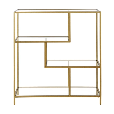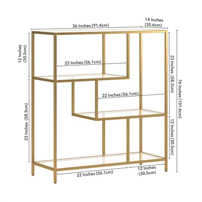 Combine functionality and on-trend design with this eye-catching and versatile bookcase. The clean lines of its steel frame instantly update any storage space, pairing perfectly with your modern home office or mid-century den. Its compact footprint makes this the perfect storage space if you’re working with a tight corner or smaller space. The geometric, staggered shelving is made of durable tempered glass, creating plenty of storage without weighing down the room visually. The four tiers allow you optimal space to display your books, pictures frames, plants and more!Features : Compact size is perfect for small spacesTabletop and shelving are made of durable tempered glassHandcrafted finish is applied to the steel frameTop and bottom shelves have a weight capacity of 30 lbs; middle shelves can support 20 lbs.Features easy assembly.Clean with a soft, dry cloth; no harsh chemicals or abrasive cleaning materials.Specifications : Product Dimensions : 36W x 14D x 40HProduct Weight : 43.21 lbs