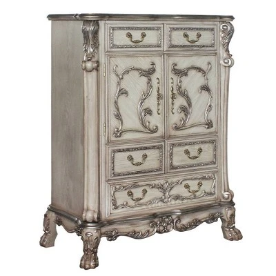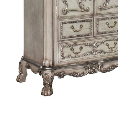 Elegant yet lightheartedly playful, the Dresden Chest is donned in an amiable Vintage Bone White finish with hand-applied burnish over the many layers of stains and finishes that are manually rubbed on, providing depth and character to this item. Classic ornamental elements of Dresden characterize the chest by the carefully chosen inlay, plentiful decorative scrolled moldings and timeless wooden claw legs. This piece is outfitted with five felt-lined drawers for safekeeping. This is sure going to bring a stunning change to your bedroom.