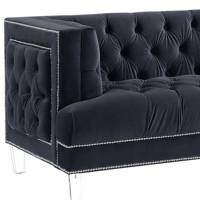 Sophistication meets modern with the Ansario living room collection. The rich blue velvet adds character to any room. Showcasing a square back, high arms, and nail-head trim, feature button tufted accents. The acrylic legs give off a modern vibe to the pieces. The full foam seats ensure that your next TV binge will be done in complete comfort. Soft velvet trim highlights the charming face of this sofa, excellent touch, high-quality foam cushions and spring support, while the tufted back enhances the design, and it will be more stylized to perfectly match your home improvement style.