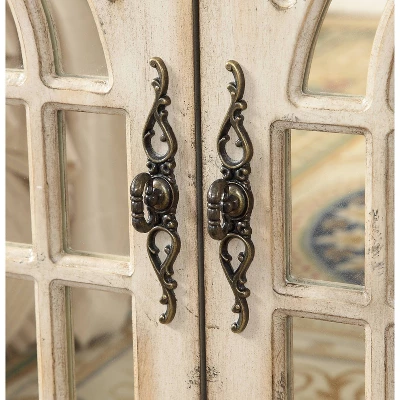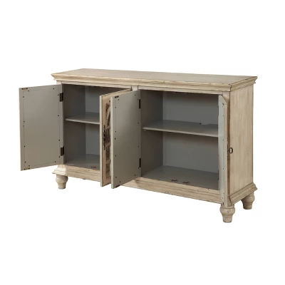 Cathedral style arched window fretwork overlays the mirrored door fronts for a look that is heavenly! Finished in harmonious Baskill French Cream, this Four Door Media Credenza features antiqued dark metal hardware, classic beveled molding and tapered bun feet. Ideal in your foyer or living area where the spacious top gives you plenty of display options and the shelved interior provides storage galore, or for use in your TV or game room, where the interior cord management system allows convenient access for your audio and video equipment.