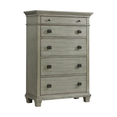 The Picket House Furnishings Clovis 5-Drawer Chest is crafted from solid pine and acacia wood, and MDF. Each piece is carefully designed with function and style. Features beautiful, dark square knobs and ball bearing drawer glides for smooth function. The top drawer is lined with felt to protect your personals. Showcases a clean-lined silhouette and a natural woodgrain finish for a touch of rustic style.