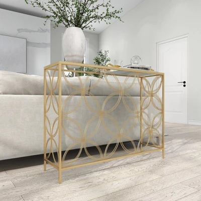 Bring a finishing touch to your home with an inviting appeal with this console table. A sturdy and long lasting construction for a years of enjoyment. Give your home a luxurious feel with this stunning gold metal with glass top side table that will compliment other sleek metal furniture and bold color background. This item ships in 1 carton. Suitable for indoor use only. This item ships fully assembled in one piece. Maximum weight limit is 100 lbs. This is a single gold colored entryway table. Contemporary style.