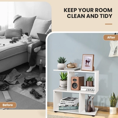 - Modern Appearance & Multifunctional Storage Shelf: With a very modern irregular geometric appearance, our 2-tier storage shelf is full of remarkably modern appeal and suitable for most decorating styles. Whether use it as a bookshelf in your study, or use as a display shelf in your living room, it will add highlights to your room.