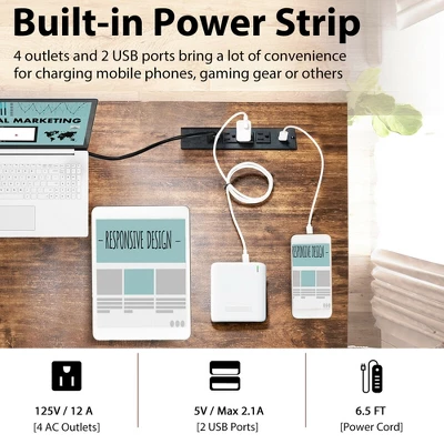 - Functional Built-in Power Strip: The multifunctional computer desk features a built-in power strip to bring much convenience when you are working. There are 4 AC outlets and 2 USB ports, making it easy to charge your laptops, pads, and phones. Besides, the 6.5ft-long cord offers more flexibility.