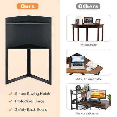 - Attached Storage Hutch & Shelf: The corner desk features an open hutch for storing daily supplies and displaying decorative items. The protective fence on the edge of the hutch prevents your stuffs from falling down. Moreover, the bottom shelf offers enough space for your books and CPU stand.