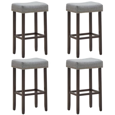 This is our brand new bar stools set, which is a great way to provide the comfort and relax for you. Made of solid rubber wood and MDF construction, these stools provide you years of durable use. The seats are firmly cushioned and equipped with the mixed linen and cotton fabric upholstery. Ergonomically saddle shape pluses feet pedals for much comfort. Classic nail head studs are set around the stools, revealing the royal atmosphere. What’s more, these upholstered stools are pretty easy to assemble with our easy-to-follow instruction. With simple and elegant design, these stools are compatible with your home, bars, office etc.