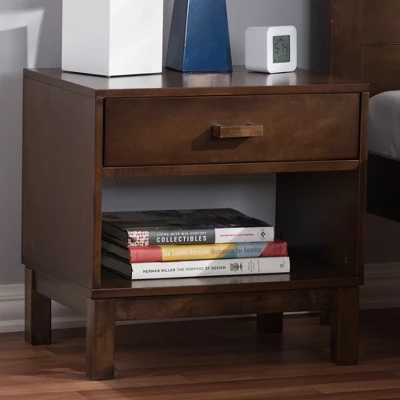 Upgrade your bedside with the clean, charming look of the Deirdre nightstand. The modern and contemporary-inspired design of this nightstand makes it easy to coordinate with the décor in your bedroom, guest room, or nursery. The sturdy rubberwood and engineered wood frame of the Deirdre is brown-finished and made to last. The nightstand features one top drawer with a wooden handle, and an open shelf directly underneath, giving you extra storage options. The Deirdre also features an under clearance area for ease of cleaning. Made in Malaysia, the nightstand requires assembly.