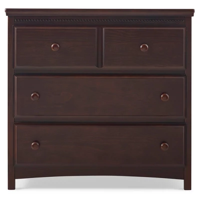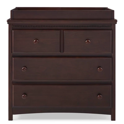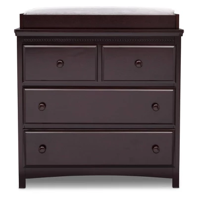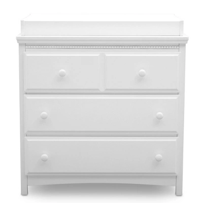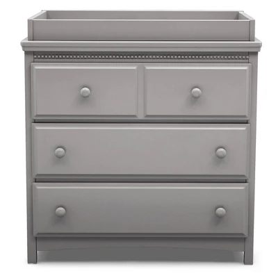 The Emerson 3 Drawer Dresser with Changing Top and Interlocking Drawers by Delta Children features a universal design with classic detailing that’s perfect for any nursery and is a great complement to the Emerson Crib by Delta Children. With a graceful, tailored silhouette and versatile design that evolves with your baby’s needs, this dresser comes with an included topper that turns the dresser into a practical changing table. The topper is easy to remove once your child has outgrown the need, so today’s changing table can transform into tomorrow’s dresser. For your child’s safety, this dresser is outfitted with an interlocking drawer system that limits the number of drawers that can be opened at one time.