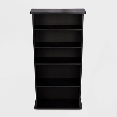 Classic design Drawbridge media storage unit by Atlantic will compliment all types of home decor! Multimedia unit designed specifically to hold all media types. Adjustable shelves offer endless customizing options for storage with 2, 3, 4, 5, or 6-shelf configuration depending on your needs Display decorative accessories in addition to media. Wide base provides structural integrity. Easy to assemble in an elegant black finish. Designed to accommodate up to 240 CDs or 108 DVDs or 132 Blu-Ray or 132 video games. There are 2 fixed shelves (one in the middle and the base) and 4 adjustable shelves to use as needed for efficient organization.