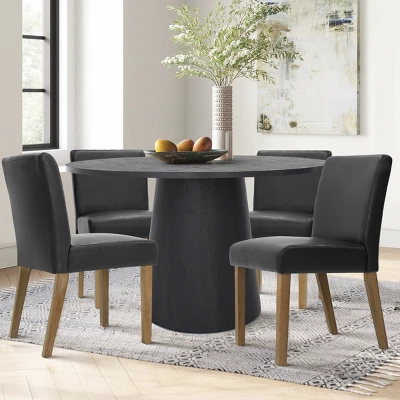 Experience the timeless elegance of this exquisite 5-piece round dining table set, expertly crafted to withstand the test of time. This set showcases a sturdy construction and classic design, making it an ideal addition to any dining space. Measuring at 46″ x 46”, this set comfortably accommodates a party of 4, providing ample room for each guest. The pedestal structure creates an open and airy ambiance, ensuring everyone seated around the table enjoys plenty of leg space for optimal comfort.The chairs are thoughtfully designed with utmost comfort in mind, featuring an engineered wood frame, foam seat padding, and high-quality faux leather upholstery. This combination guarantees a cozy seating experience and allows for multiple sitting positions.Supported by four rubberwood legs and a sleek natural wood grain finish, these chairs offer sturdy support for individuals weighing up to 250 lbs. The soft and textured faux leather upholstery adds a touch of sophistication and invites guests to relax and enjoy their meals. The chairs’ sleek design seamlessly complements any decor style, making them a versatile choice for your dining area.