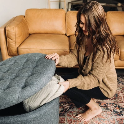 Designed to offer comfortable seating, practical storage, and timeless style to your home, this 28″ round pintucked storage ottoman will be a versatile investment piece for years to come. The classic round frame is offered in a range of fabrics and wood leg finishes that will work with your existing decorating style. Enjoy storing blankets, puzzles, games, or remotes and a comfortable seat for guests when you entertain. With added premium pintucking details, this round storage ottoman will serve it’s purpose in your family room, bedroom, or entry way.