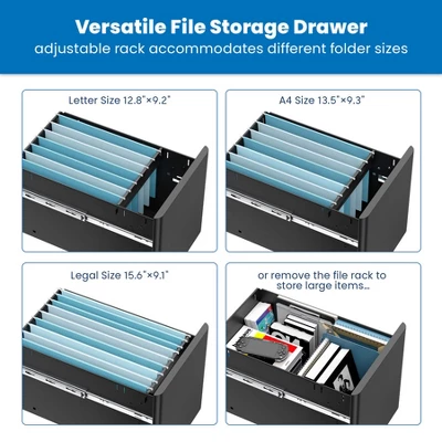 - Three drawers provide ample storage capacity for letter, legal, and A4 size folders as well as other office supplies