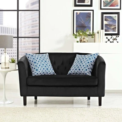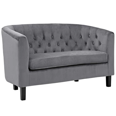 Intrinsically luxurious, Prospect is a throwback to the classic Chesterfield design, while delivering an engaging modern look filled with passion and drive. Button tufting and sweeping curves blend to form a contemporary lounge piece that all will be drawn to. This cozy loveseat with espresso stained wood legs and non-marking foot caps features comfortable foam padding and a soft, stain-resistant velvet polyester upholstery.