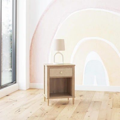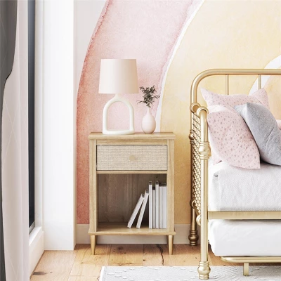 Your little wildflower will love basking in the warm beachy glow of calm coastal tones with the Little Seeds Shiloh collection. This boho-chic collection features engineered wood frames laminated in a natural earthy woodgrain finish coupled with slightly textured faux rattan drawer fronts. The creamy gold tapered feet and hardware add a touch of glam while capturing the essence of vintage elegance. Truly make their space shine by accenting your little one’s room in pastel color palettes like blush pink, light blue, pea green, and sunshine yellow. The Little Seeds Shiloh Nightstand offers a convenient drawer for bedtime essentials, and an open cubby below for books and other nighttime treasures. The Shiloh Nightstand has been thoughtfully engineered with durable metal drawer slides and built-in stops for safety. The Nightstand meets or exceeds the CPSIA Juvenile testing requirements and includes a wall anchor kit to ensure your child’s safety. Little Seeds offers this and many more on-trend baby to teen furniture pieces and partners with various environmental protection programs to protect pollinator and other wildlife habitats for future generations. Bonus Tip: Natural and synthetic rattan can create thousands of tiny catch-all, hard-to-clean spaces for dust and other contaminants to hide. The Little Seeds Shiloh collection uses a faux rattan laminate that not only makes it a snap to keep clean and sanitary but also discretely keeps the contents of the dresser out of sight. Two adults are recommended to assemble. Once assembled, the Nightstand measures to be 19.69″ W x 15.08″ D x 26.81″ H.