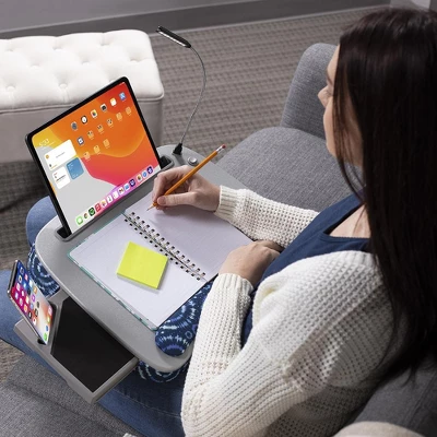 The Sofia + Sam Multi Media Memory Foam Lap Desk is the ultimate workstation for anyone using a laptop, tablet or smart phone. The lap desk allows you to work on a laptop or tablet, watch tv, write or read while staying alert to your phone for incoming calls and messages. Patent Pending