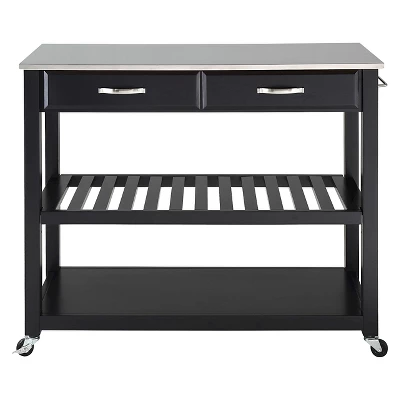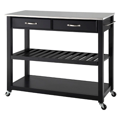 Create the culinary space of your dreams with a Stainless Steel Top, Portable Kitchen Cart/Island from Crosley. Constructed of solid hardwood with wood veneers and heavy-duty casters, this kitchen island is designed for longevity and portability. The contemporary stainless steel top expands your serving and countertop space while the built-in drawers and adjustable shelf offer much-needed extra storage. Raised panel detailing clean, sleek lines provides the ultimate in style to dress up any space. Style, function, and quality make this portable kitchen island a versatile, must-have addition to your home.