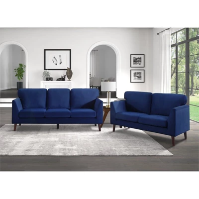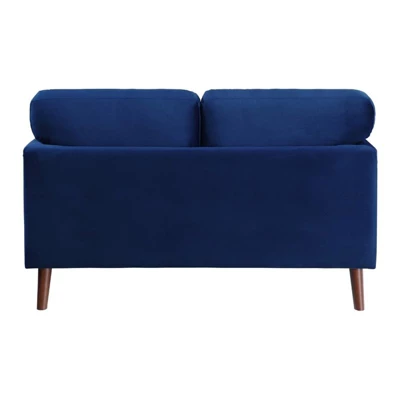 Created for a modern space, the Tolley Collectionās vibrant hue and streamlined profile will perfectly accent your homeās living room. The love seat is supported by dark brown finished wood legs that complement the blue velvet upholstered cover.Features : Solid wood and plywood frameFoam padding over pocket coilsVelvet fabric upholsteryReversible back and seat cushionsExposed wood feet with dark brown finishRemovable cushion covers with zipperAssembly requiredSpecifications : Product Dimensions : 35.00″ H x 58.00″ W x 32.00″ DSeat Width : 45″Seat Depth : 20″Seat Height : 19″Arm Height : 25″Product Dimensions : (Doorway width required) 20.5″Product Weight : 61.75 lbsWeight Capacity : 300 lbs per seat